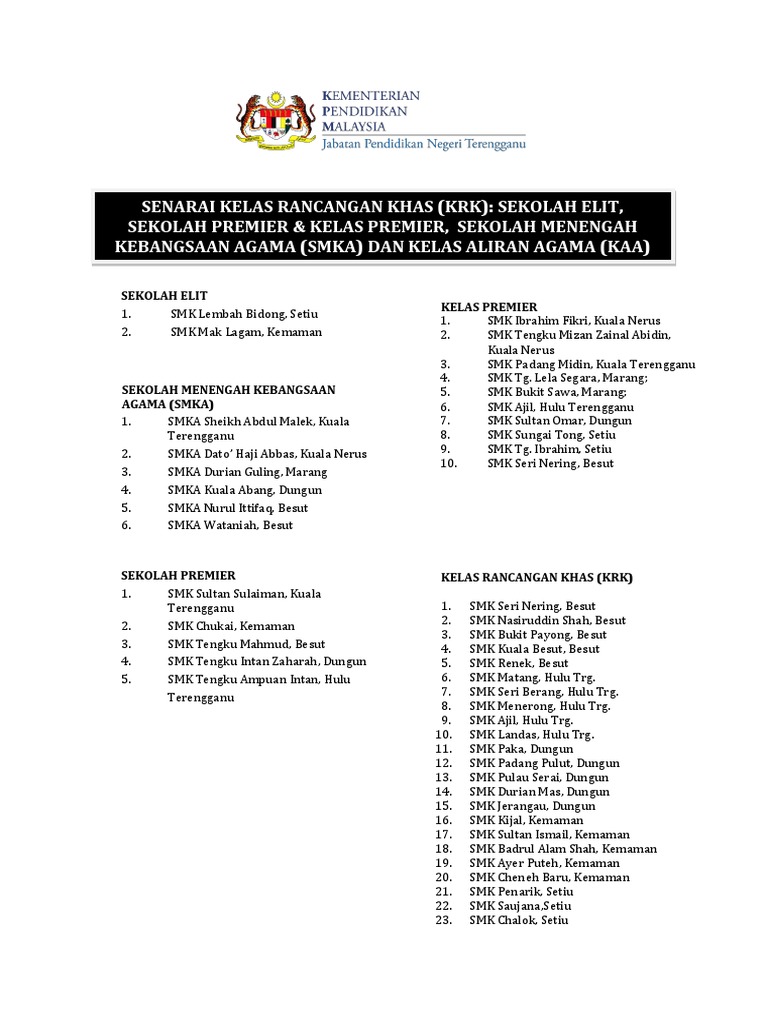 Senarai Krk Sekolah Elit Premier Kelas Premier Smka Kaa Diterengganu Pdf