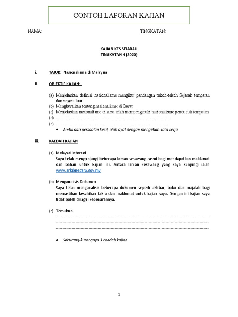 Contoh objektif kajian sejarah pt3 2020 tingkatan 3 pendidikan vernakular barat masalah perpaduan di malaysia sebelum selepas kemerdekaan. Yang menarik dikongsikan untuk anda contoh dan hasil kerja folio sejarah tingkatan 3 dari kalangan pelajar yang telah. Panduan laporan kajian bagi.